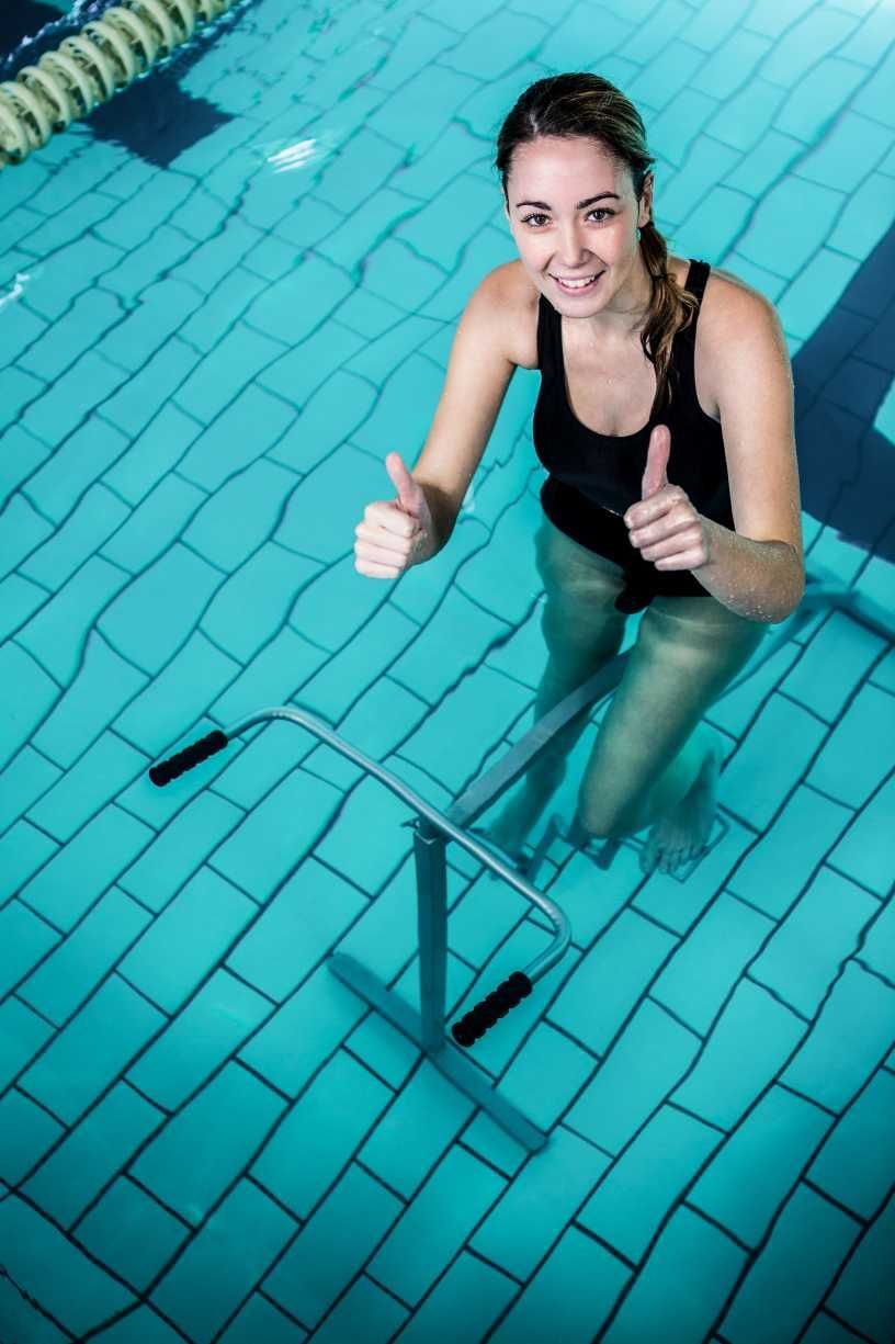 Ein erfrischendes Ganzkörpertraining auf fetzige Musik. Es wird sitzend und stehend auf einem Aqquatix Bike geradelt, der Oberkörper wird mit Kleingeräten trainiert. Aqua-Cycling kräftigt die Muskulatur, strafft die Haut, fördert das Herz-Kreislauf-System und ist optimal für die Durchblutung. Die Bikes besitzen eine Widerstandsschraube und sind somit für jedes Fitnesslevel geeignet. Sie benötigen keine speziellen Schuhe.